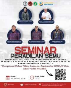 Dalam rangka menyambut Hari Ulang Tahun (HUT) ke-73 Yayasan Dwijendra, Fakultas Hukum Universitas Dwijendra menyelenggarakan kegiatan Seminar Akademik sekaligus Pembukaan