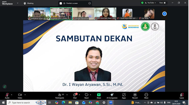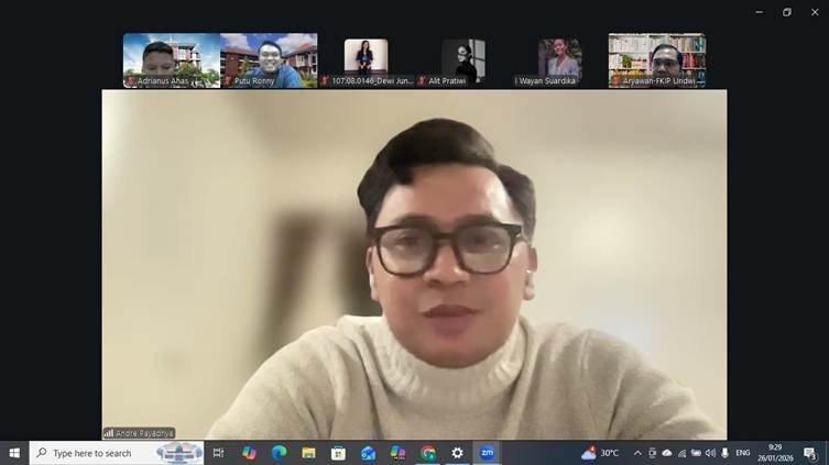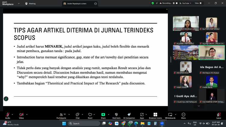 Fakultas Keguruan dan Ilmu Pendidikan (FKIP) Universitas Dwijendra menyelenggarakan Workshop “Optimalisasi Kompetensi Dosen dalam Penulisan dan Publikasi Artikel di Jurnal Internasional Bereputasi” pada Senin, 26 Januari 2026. Kegiatan ini merupakan bagian dari rangkaian peringatan Hari Ulang Tahun ke-73 Yayasan Dwijendra Denpasar dan dilaksanakan secara daring melalui platform Zoom Meeting.