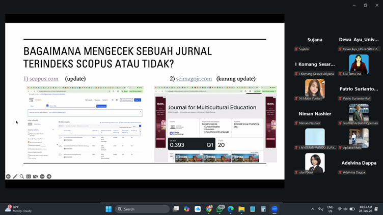 Kegiatan yang dimulai pukul 10.00 WITA ini diikuti oleh dosen FKIP dan civitas akademika Universitas Dwijendra dan perguruan tinggi mitra dengan antusias. Sesi diskusi berlangsung interaktif, ditandai dengan berbagai pertanyaan terkait pemilihan jurnal yang tepat, proses review, serta strategi menghadapi revisi dari reviewer internasional.